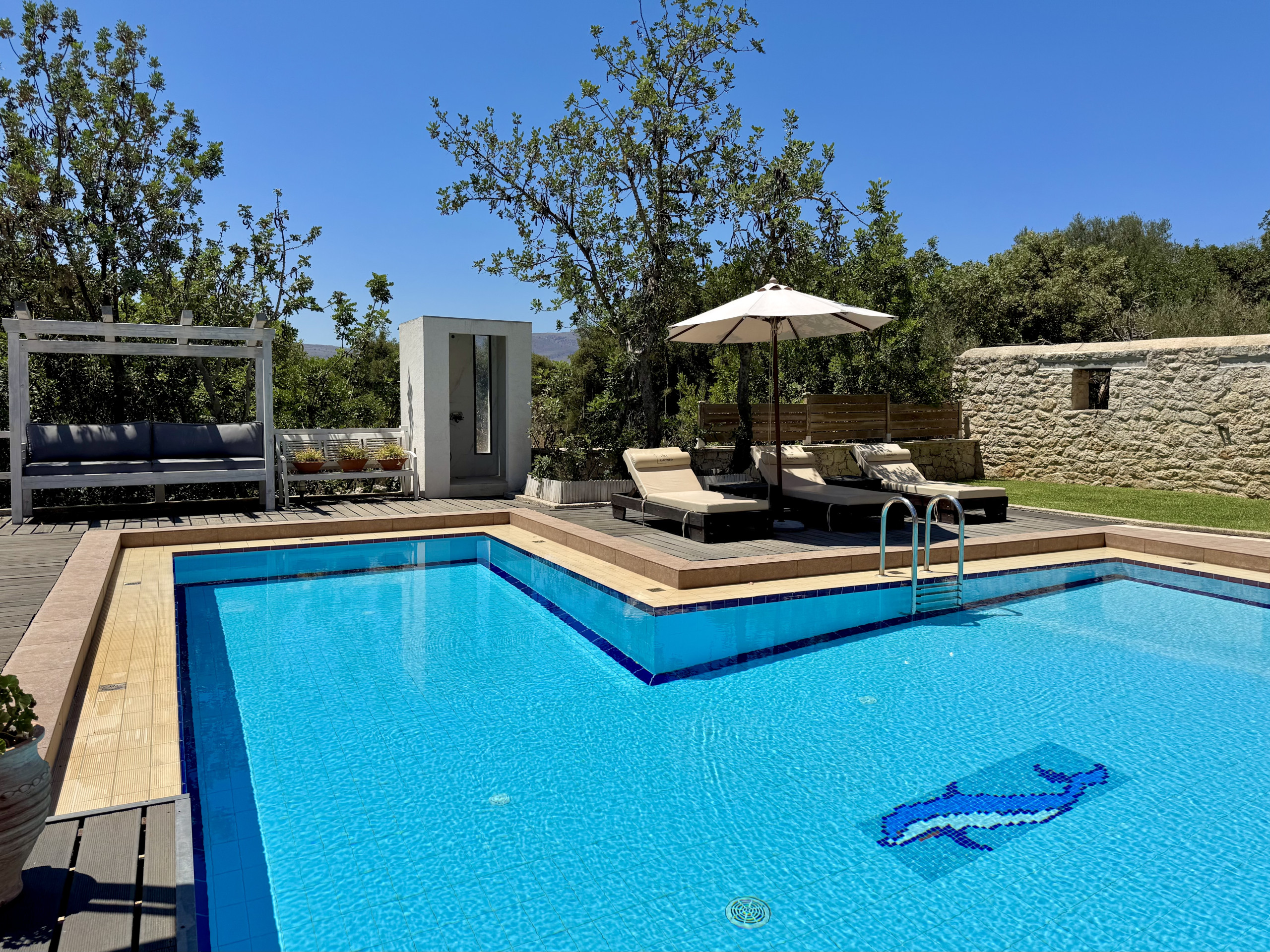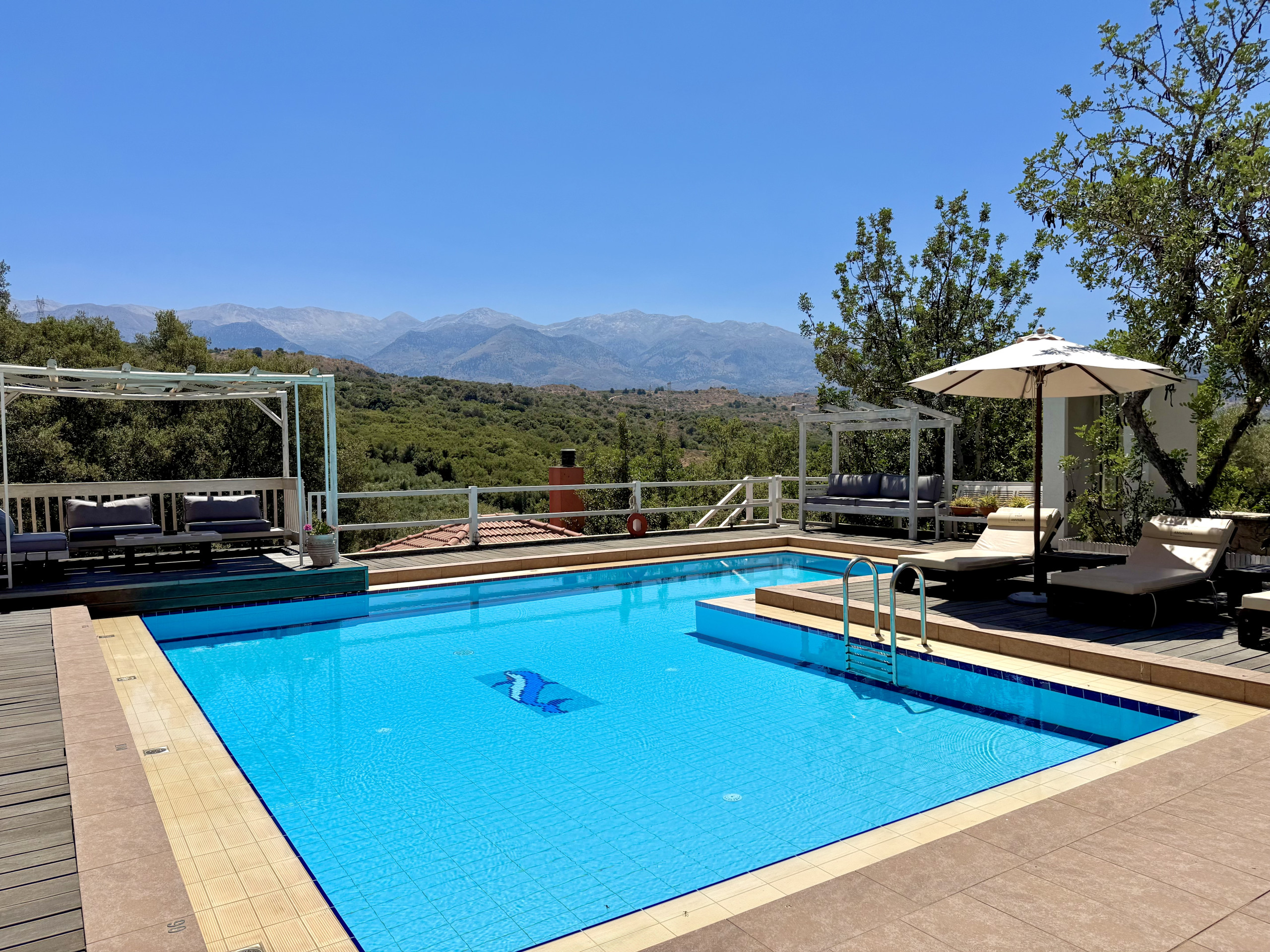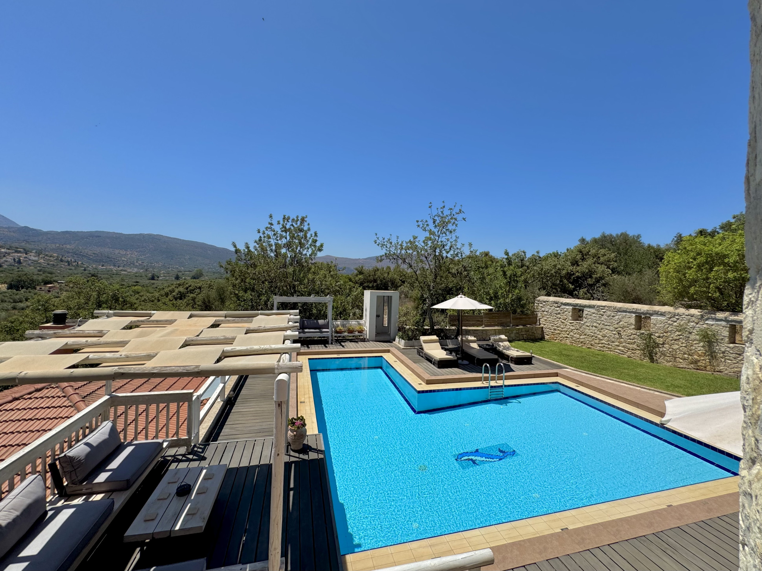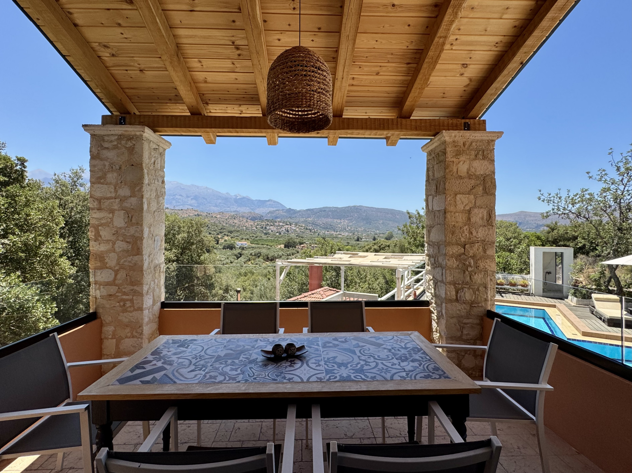 What a gorgeous villa and beautiful surroundings. We had very much wanted privacy and peace and quiet which is exactly what we got. Knowing Kalyves and Almirida well, we were looking for somewhere close by and this was perfect. The pool area and outside areas were simply lovely, enabling you to either chase the sun all day or escape into a shady area. The views are stunning with the mountains all around. The pool itself is just fabulous and we spent most of our time floating around! The evenings were lovely sitting in the warm air and enjoying a G&T under the stars. Bed was very comfortable and view from master bedroom just stunning. We didn't use the jacuzzi and whilst we absolutely loved the Cretan Kitchen, we only used once as couldn't get the extractor to work so the room filled with smoke pretty quickly. Plenty of amenities in the village to get you by including a fantastic butchers. The welcome pack enabled us to have a glass of wine on our late arrival and some fresh water before heading down to the bakery the following morning for breakfast supplies. Kalyves is a very short drive for one of my favourite beaches and plenty of tavernas for delicious food. We will definitely return!