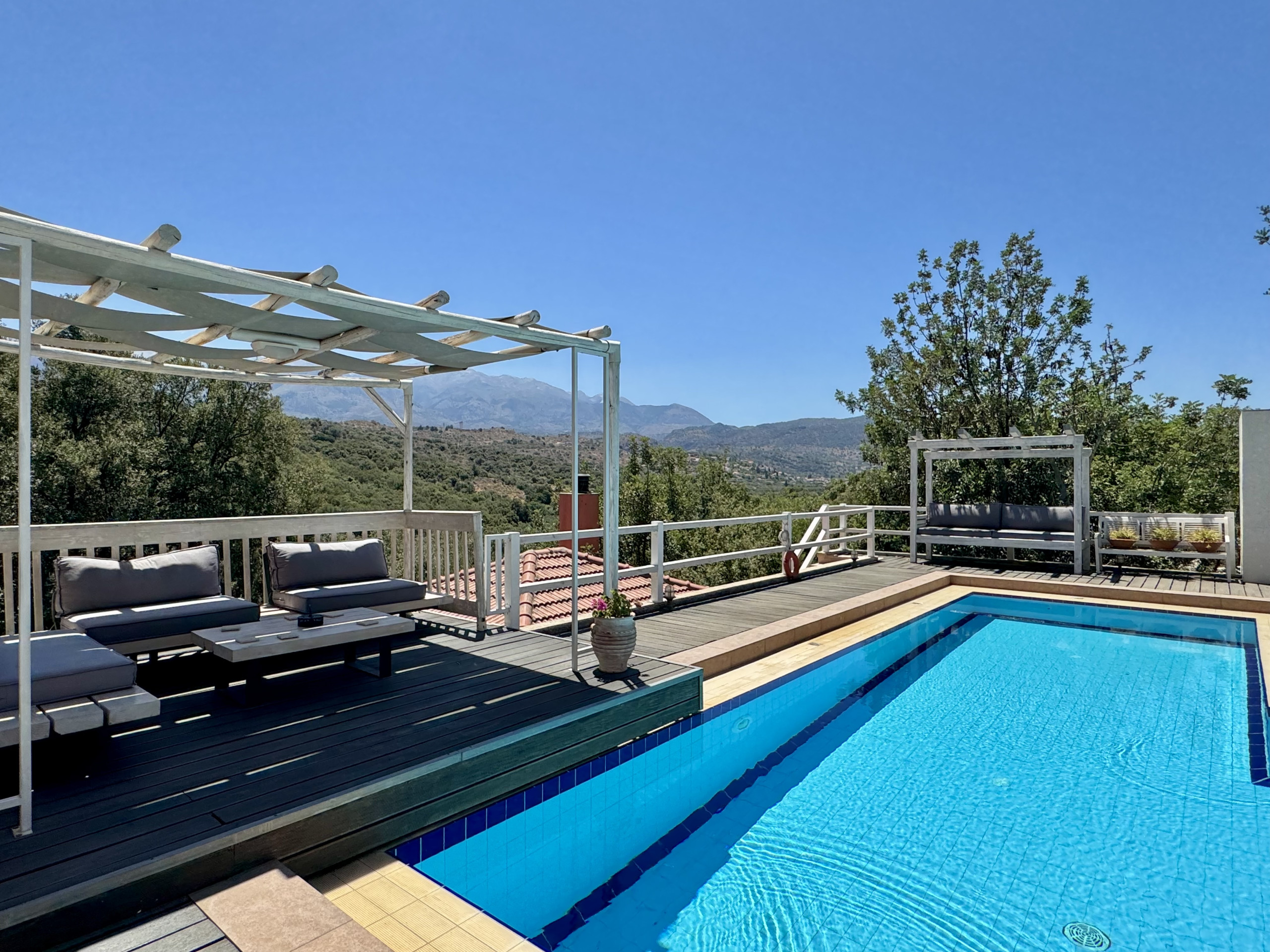 The villa is very spacious and well appointed and provided plenty of room for 4 adults (myself, my wife and two adult sons). The kitchen was well equipped, the bedrooms comfortable and furnished with good quality mattresses (always a key consideration for me) and there was copius hot water for showering. The outside areas are extensive and provide plenty of spaces for some quiet time. The pool is excellent, there are plenty of sunbeds and the layout ensures there is always somewhere shady to sit if you need to get out of the midday sun. There is also a very well placed and comfortable hammock that got well used! The Cretan barbecue area provides a great cooking alternative and has a second fridge which was very useful for maintaining a good supply of chilled drinking water and other beverages. Overall very pleased adn would definitely consider re-booking if returning to Cre