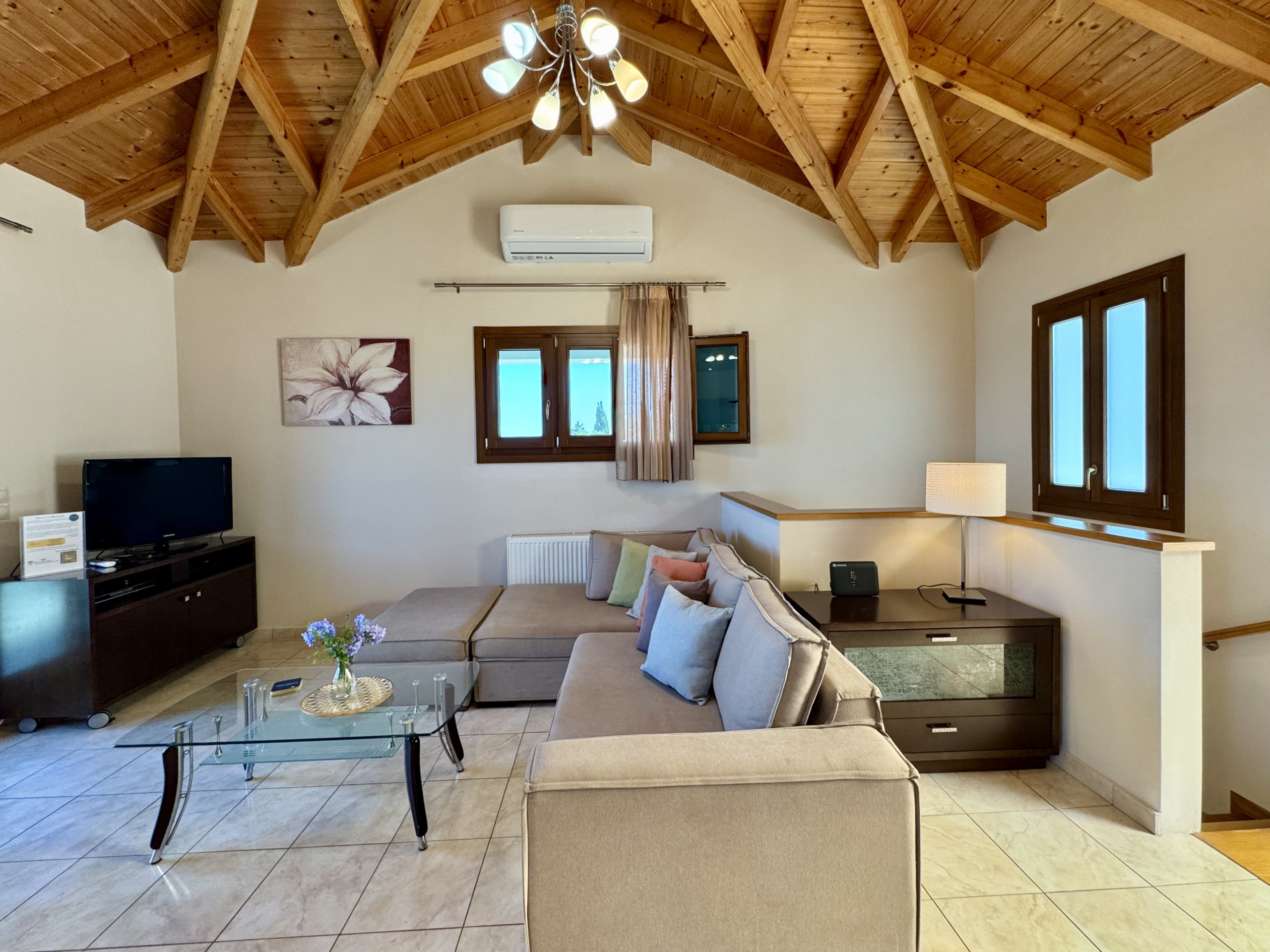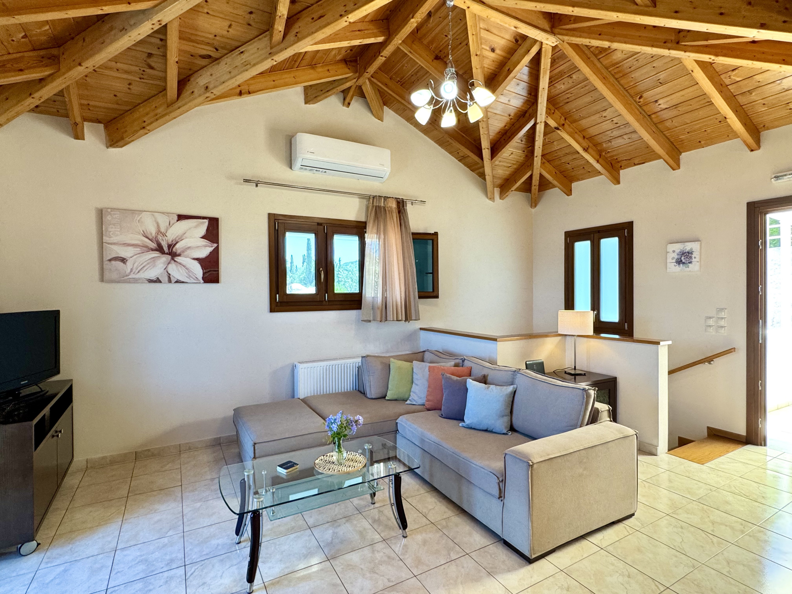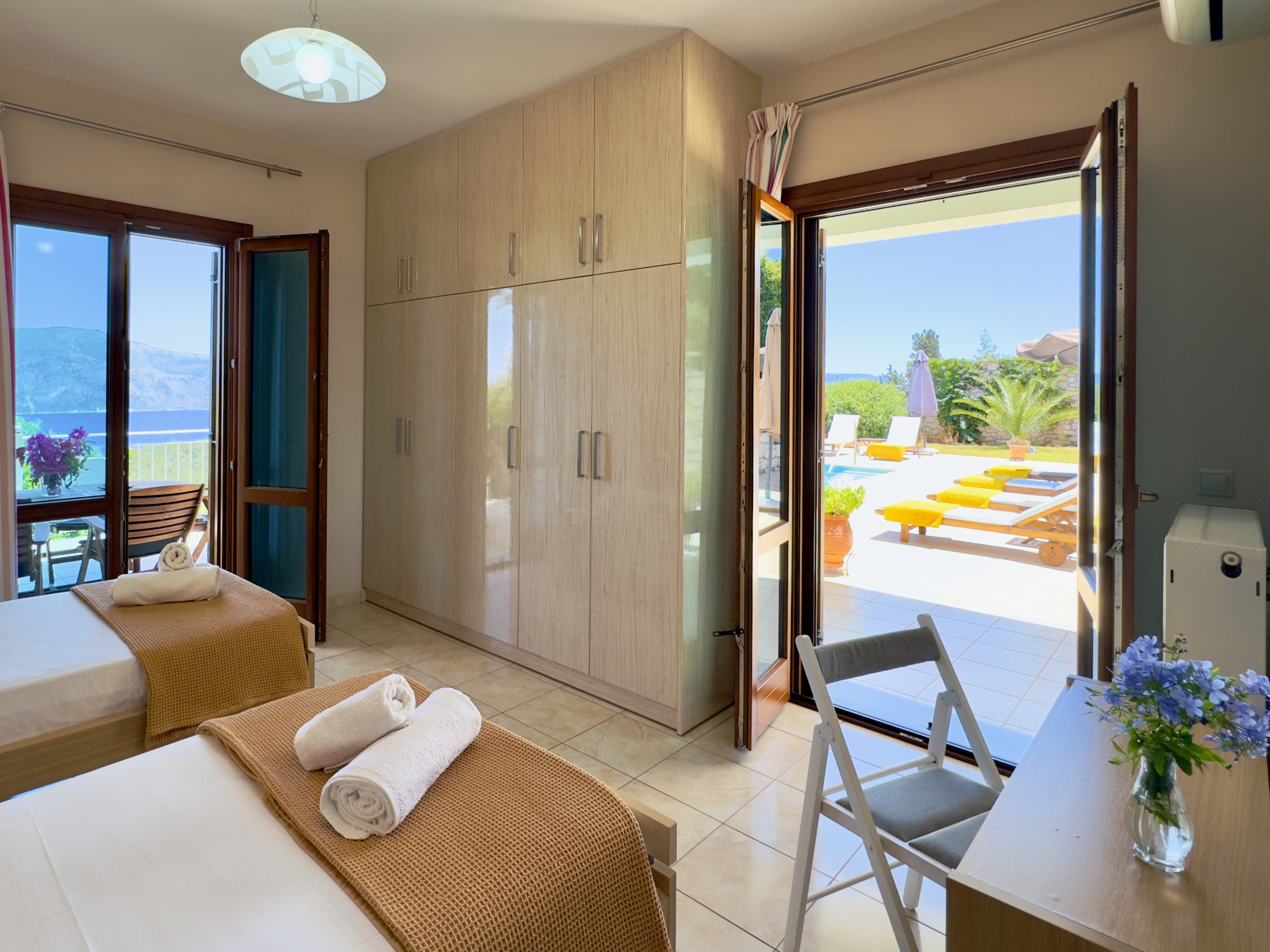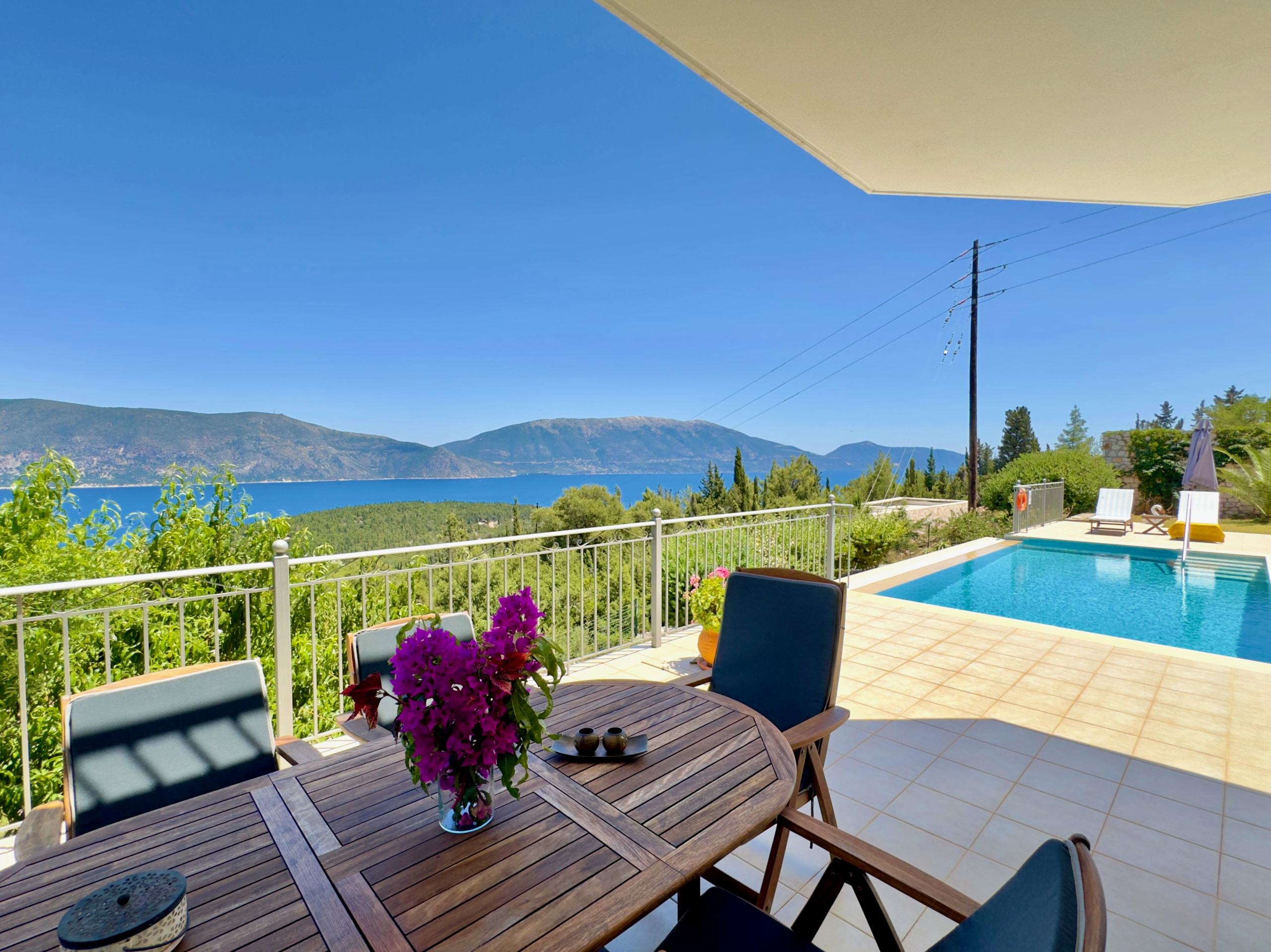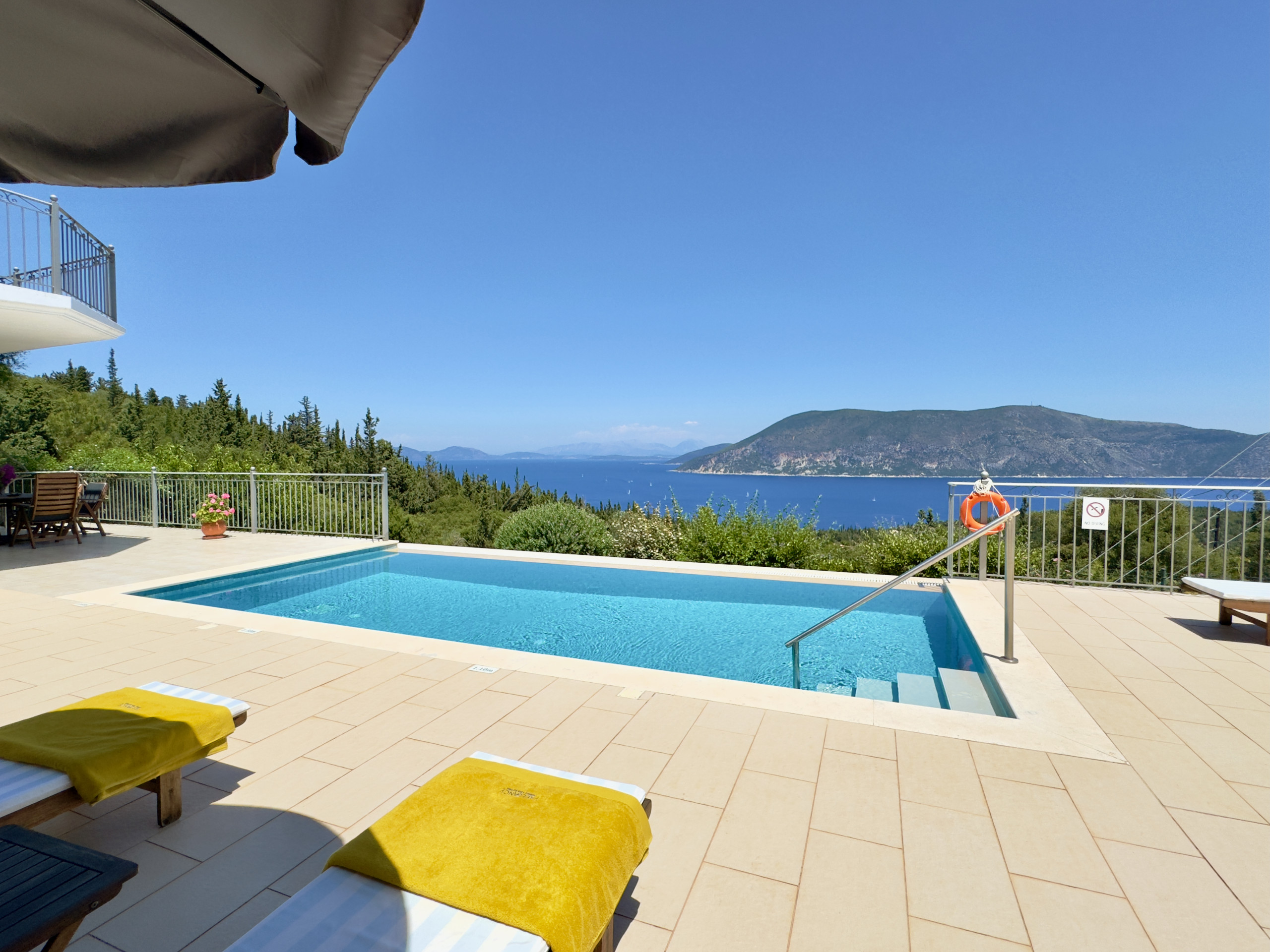 Wonderful villa with fantastic views. We very much enjoyed our stay in the spotless villa that has everything you need for a great holiday. We especially enjoyed the pool that overlooks the beautiful hills and sea and used the two large umbrellas to shade the pool during hot afternoons. The location is convenient as it is an easy drive into Fiscardoto Magganos where there are several grocery stores and places to eat. We would love to stay again.