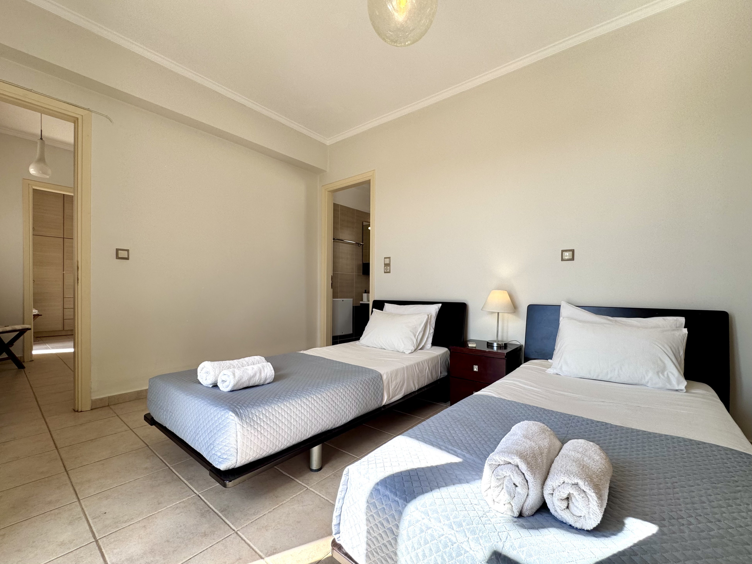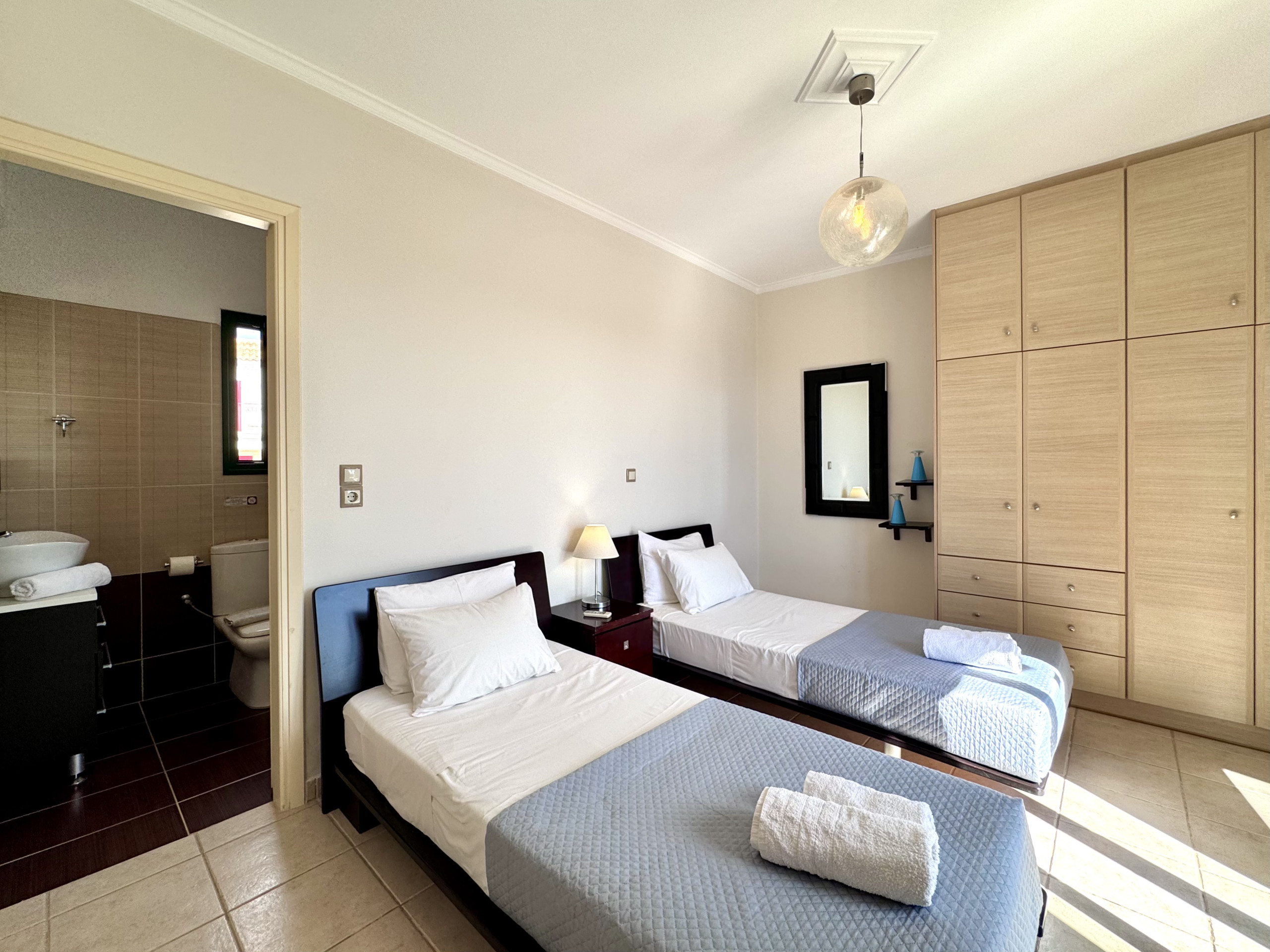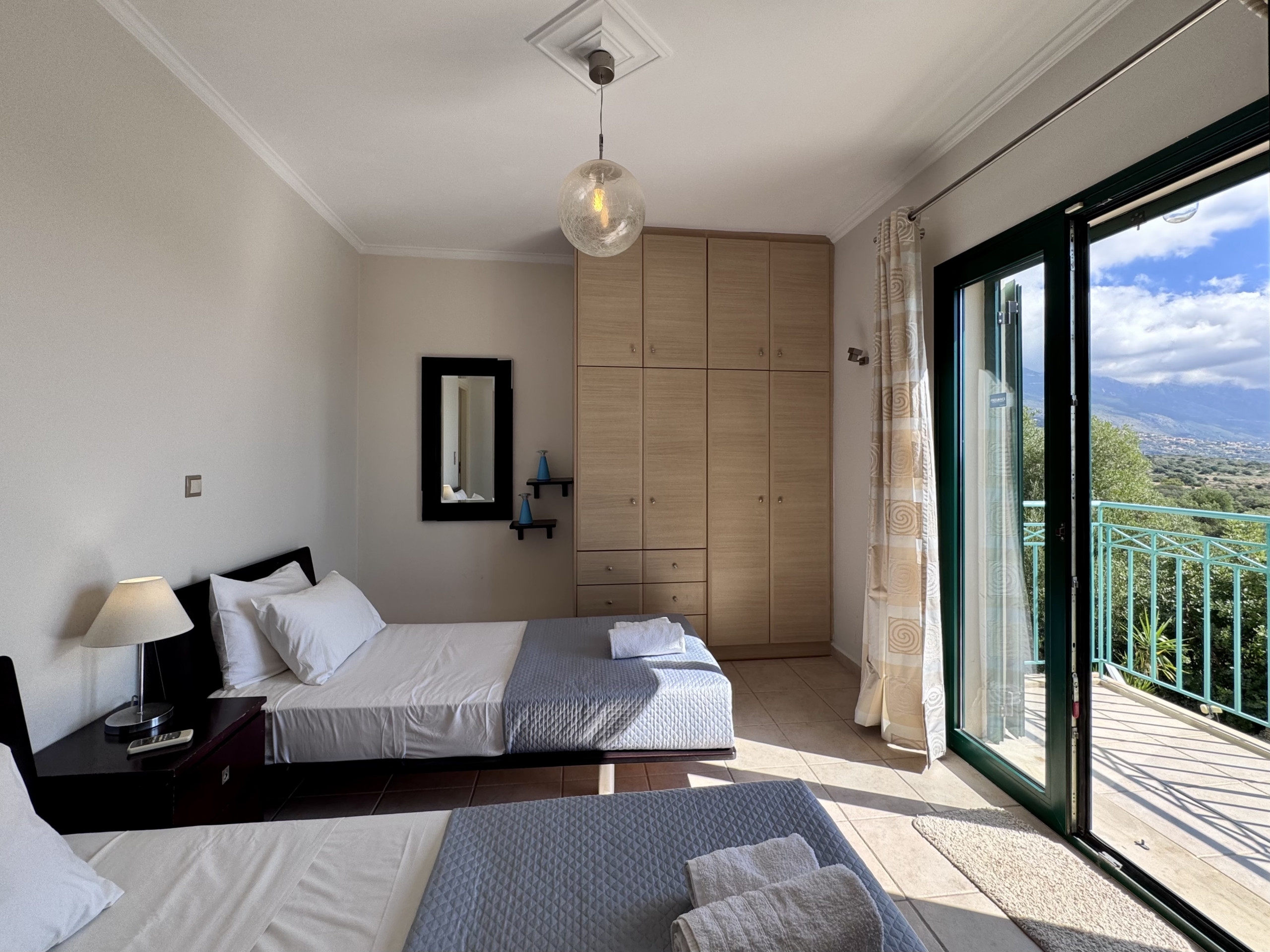Zweibettzimmer mit Badezimmer en suite - 2 Einzelbetten, Französische Türen zum Balkon mit Meer- und Bergblick, Badezimmer en suite mit Dusche, Waschbecken, WC. Klimaanlage