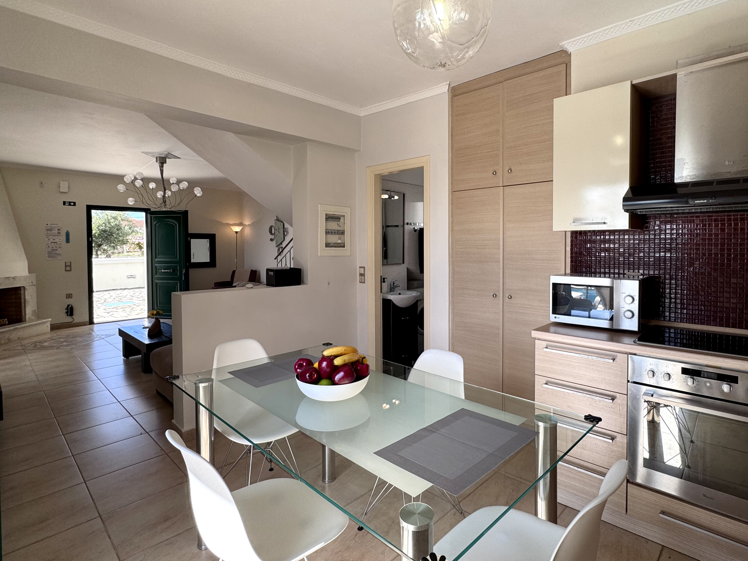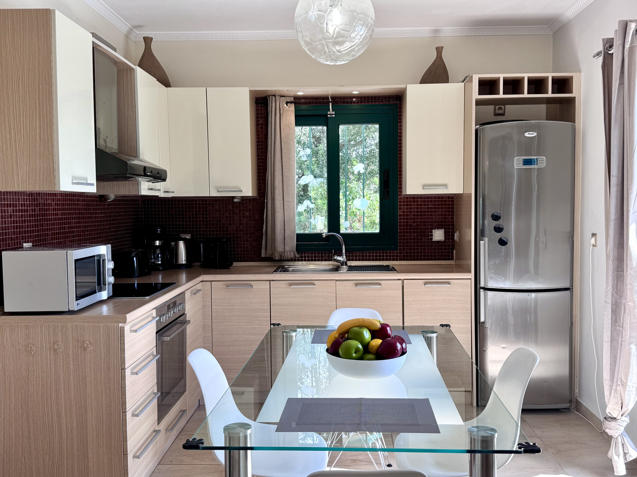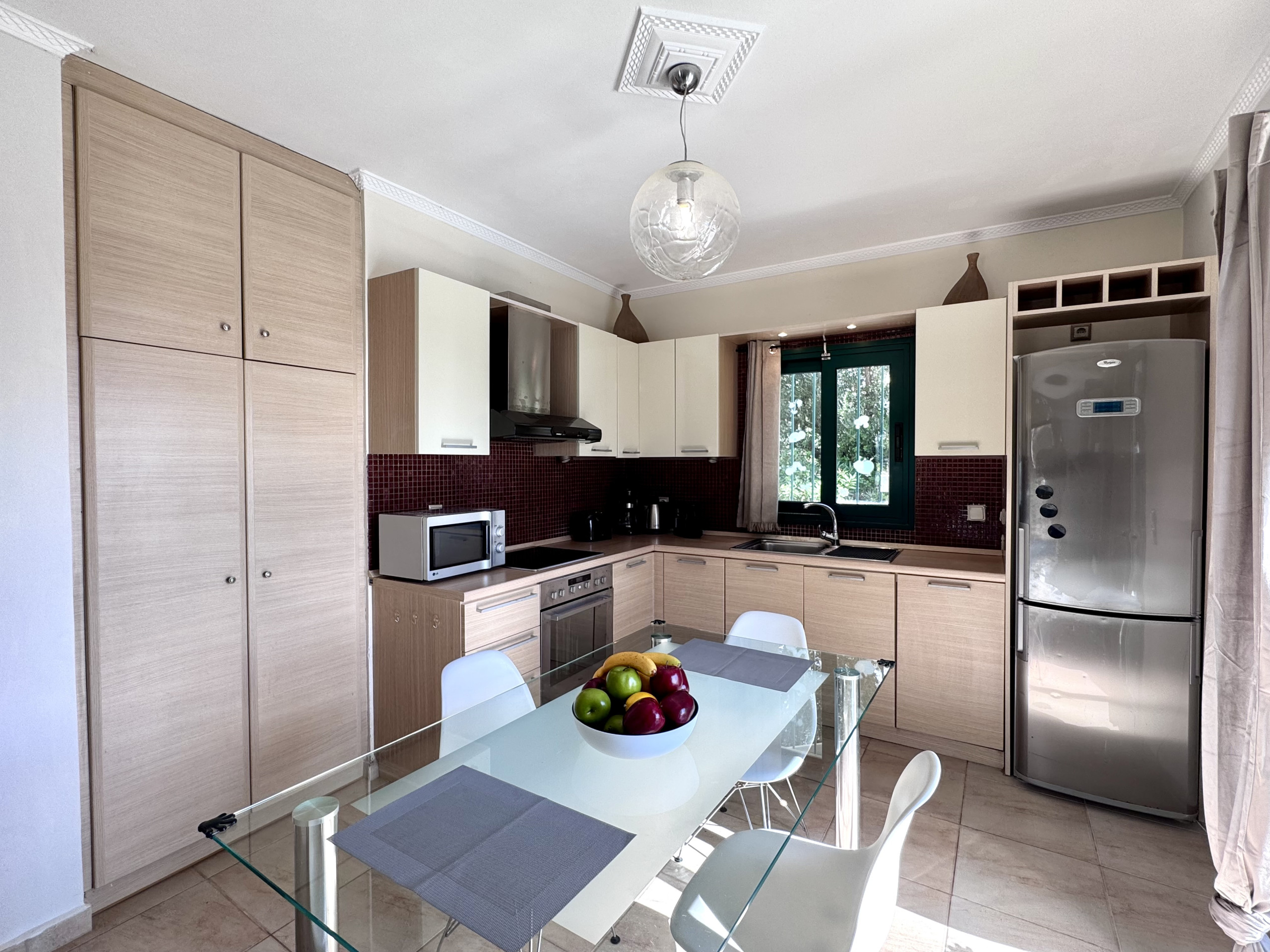 Küchenbereich - Holzeinbauschränke, Spüle, Elektroherd und Elektroherd, Mikrowelle, Espressomaschine (Nespresso Original-Kapseln), Geschirrspüler und Kühlschrank-Gefrierkombination. Fenster über der Spüle zum Garten- und Poolbereich. Französische Türen zur teilweise überdachten Poolterrasse.