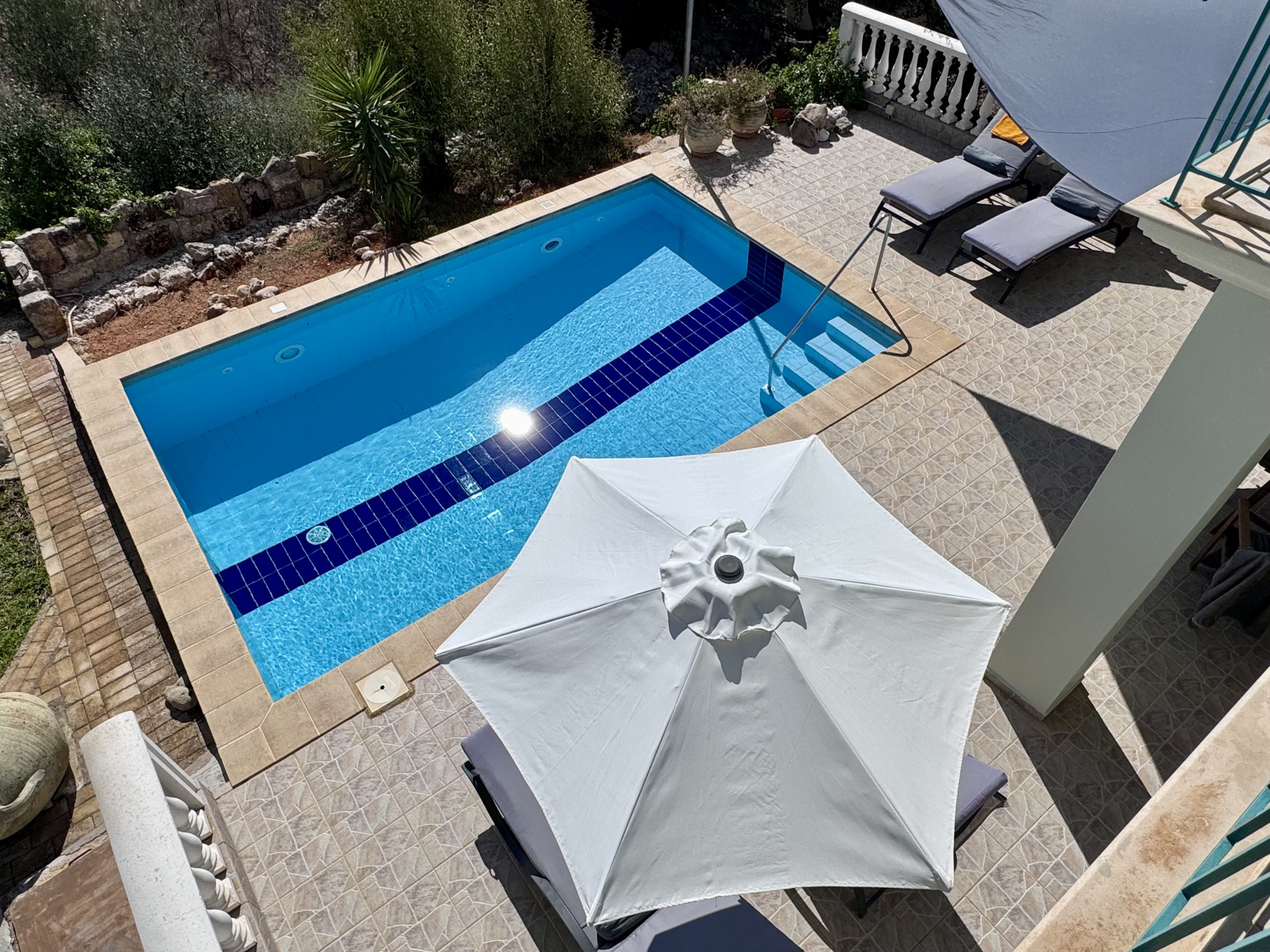 Sonnenterrasse - Gefliester Bereich neben dem Pool mit Sonnenliegen und Sonnenschirm