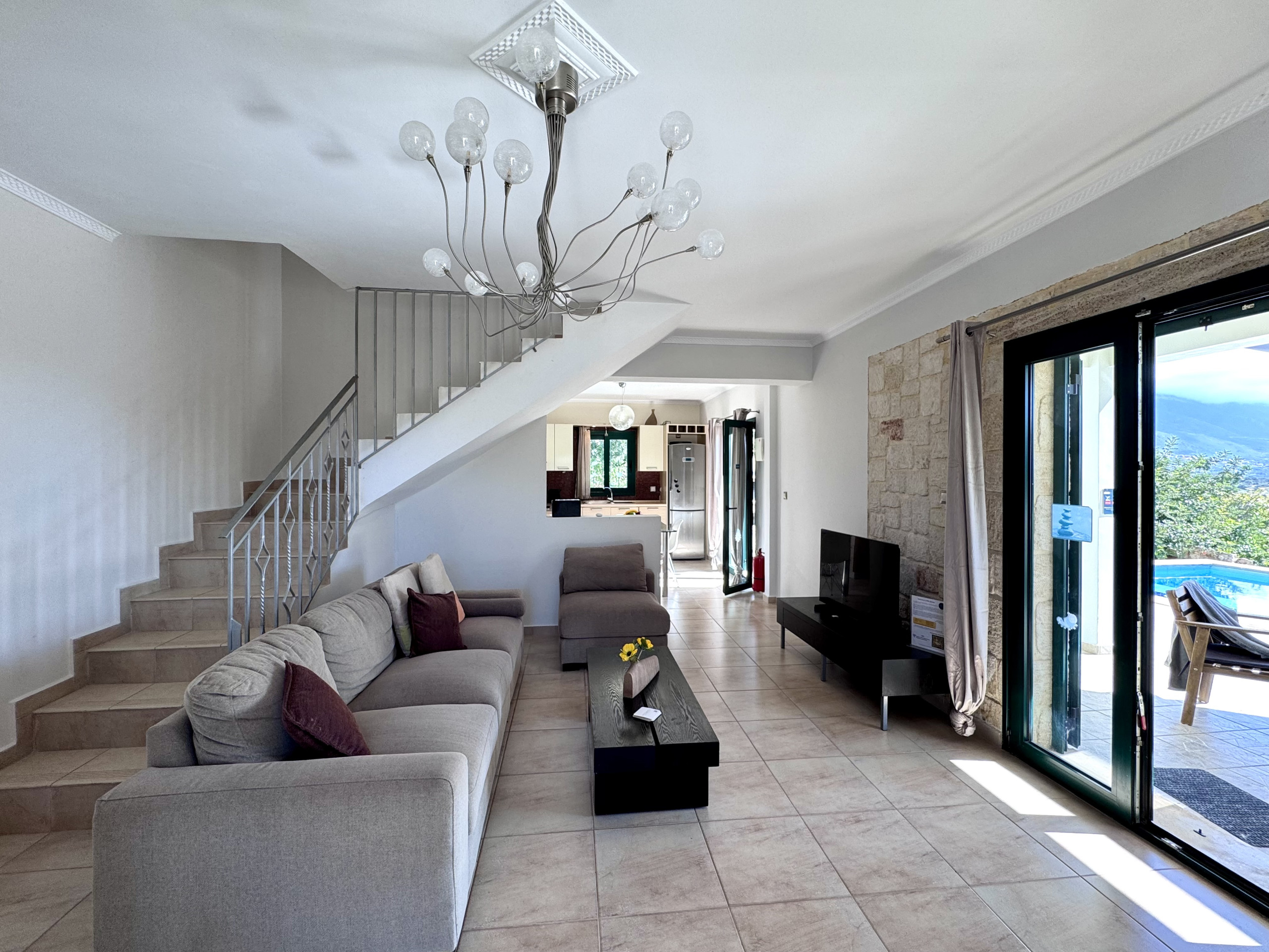 Sitzbereich - L-förmiges Sofa, Flachbild-TV (begrenzte Kanäle/nur Nachrichten), Treppe in den ersten Stock. Französische Türen zur überdachten Poolterrasse.