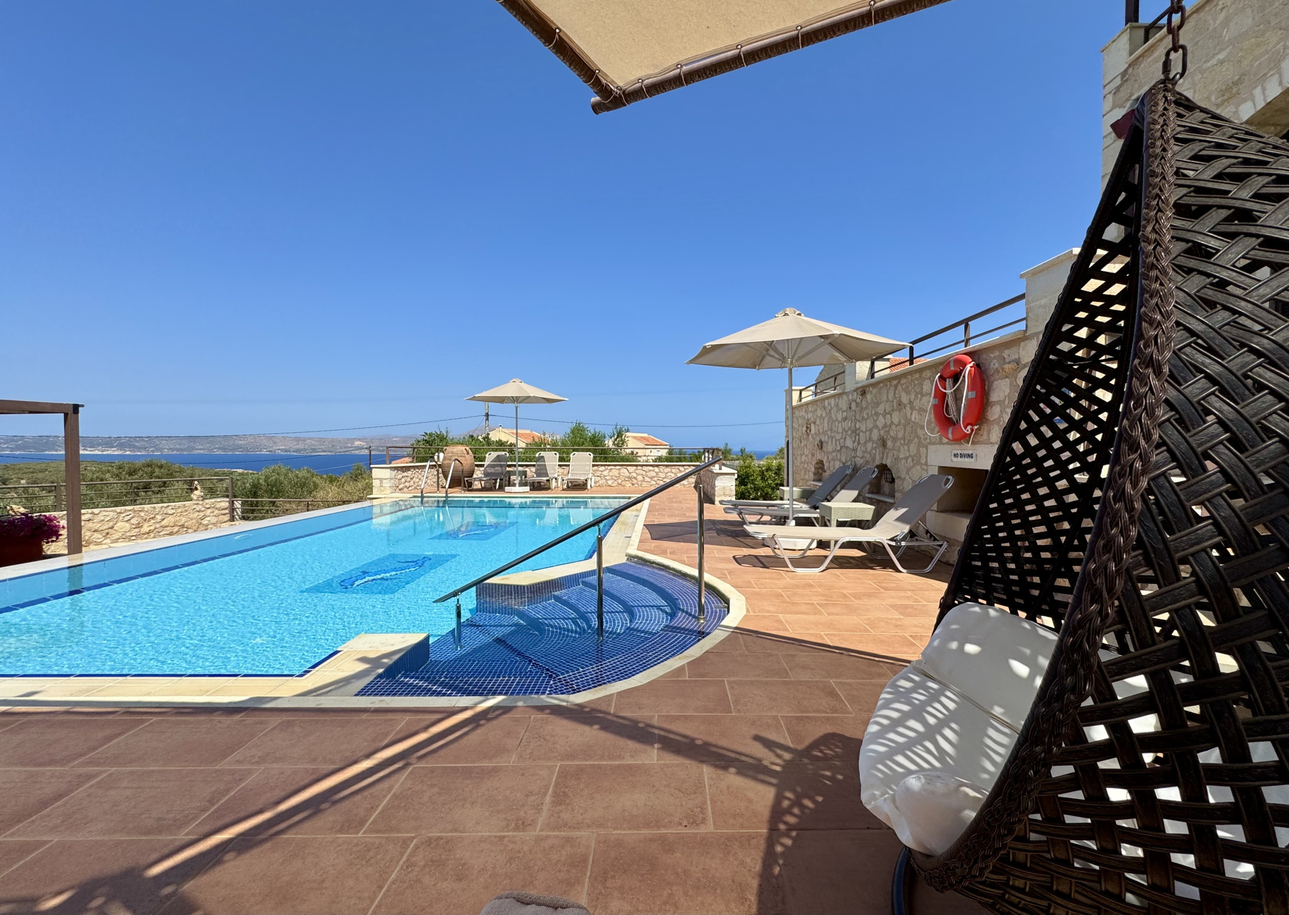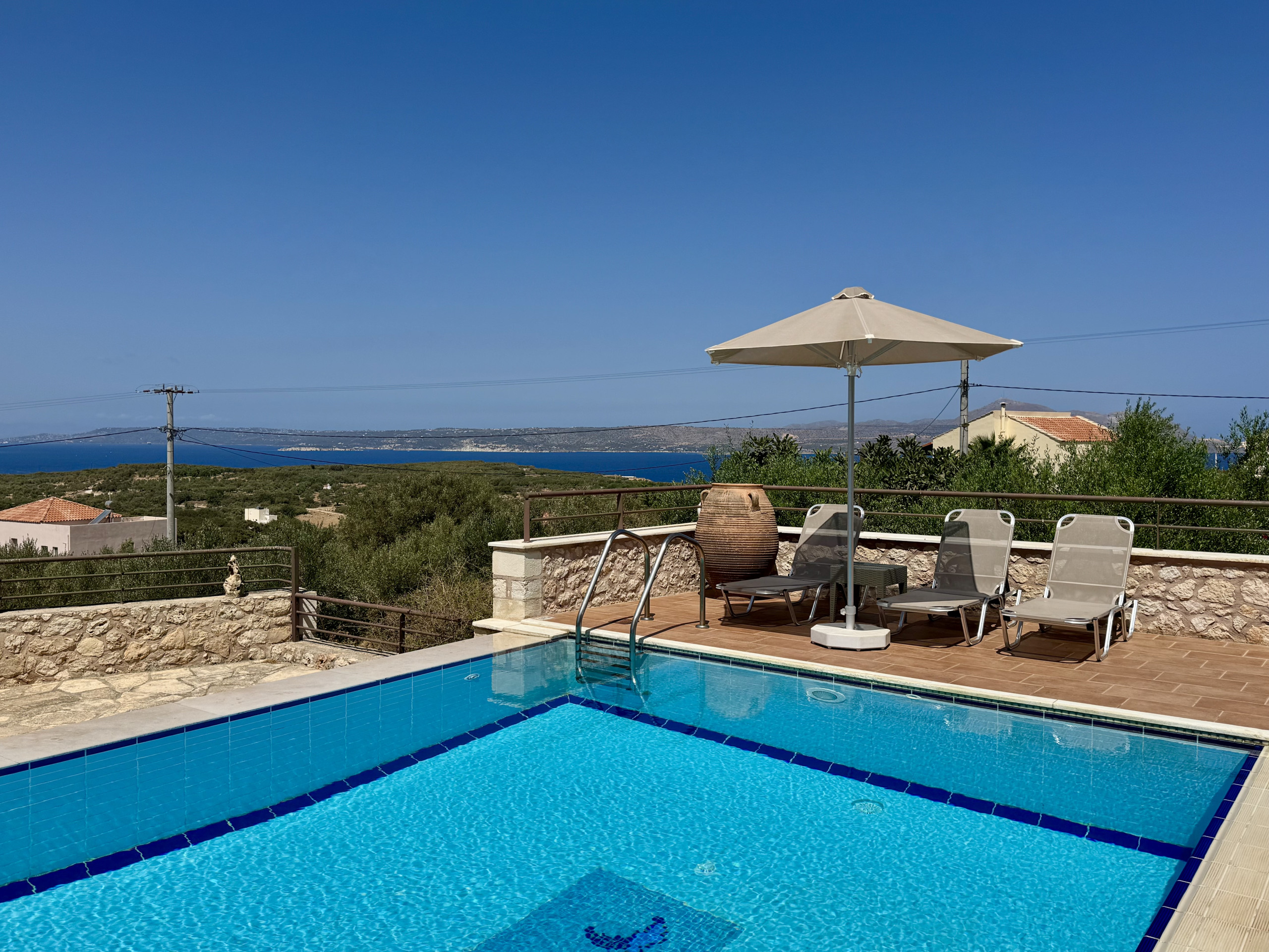 The location is perfect, with only a short (10 minute) walk to the Plaka village for the tavernas and local supermarkets. The stunning views from the terrace and poolside, especially the sunsets make this a fantastic location for a holiday. The air conditioning in the bedrooms was essential, and the pool a blessing for cooling off in the hot Cretan sun. Access to t