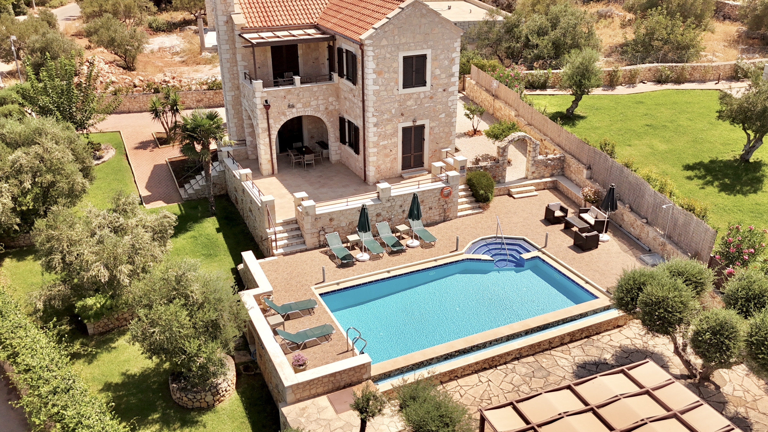 The villa is well designed and having the three shower rooms is a bonus .The gardens are beautiful and colourful and the swimming pool and its surroundings are stunning. |