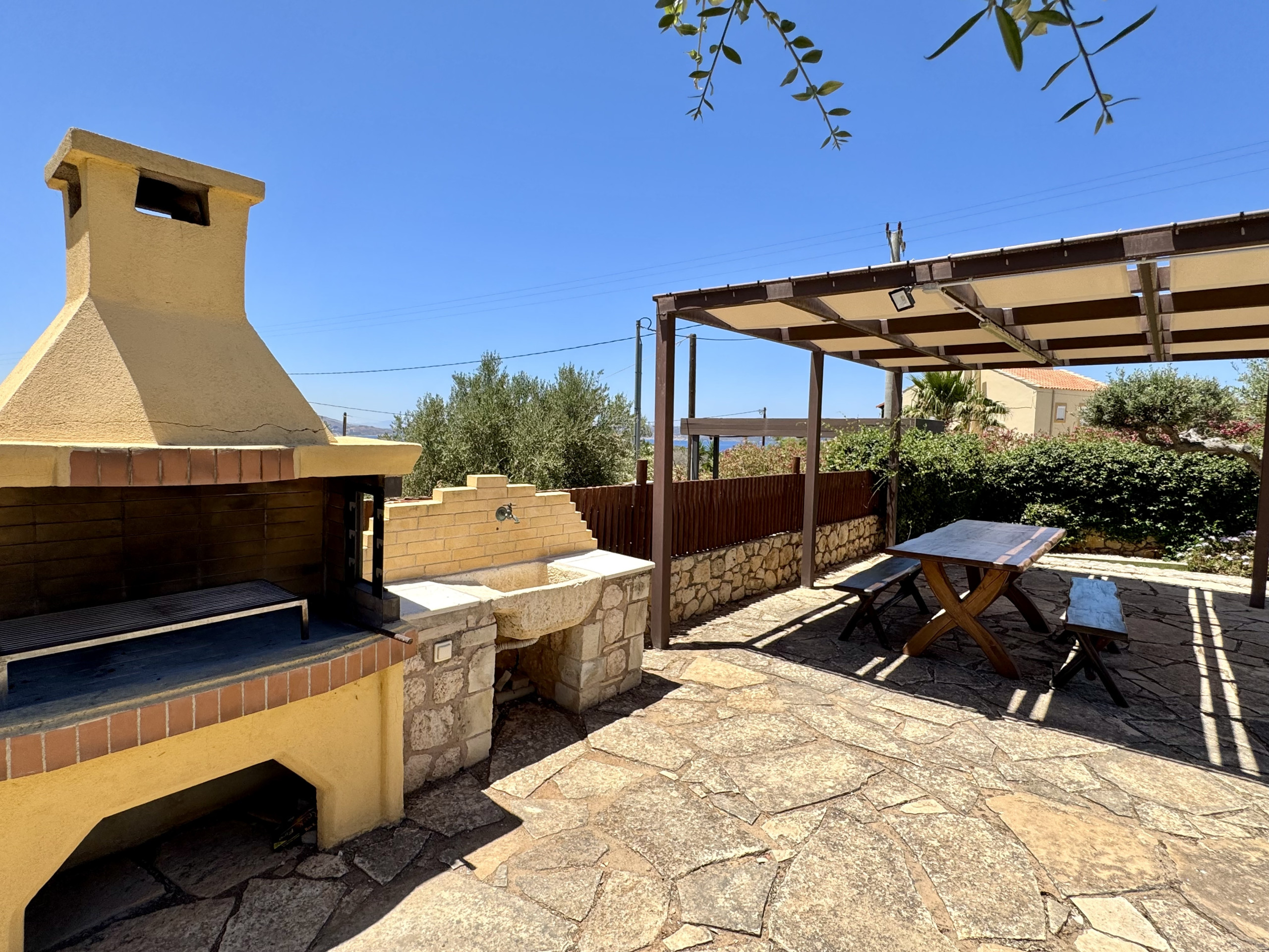 Sea View Barbecue Terrace - Purpose built barbecue, dining table with benches under a pergola, sink with tap.
