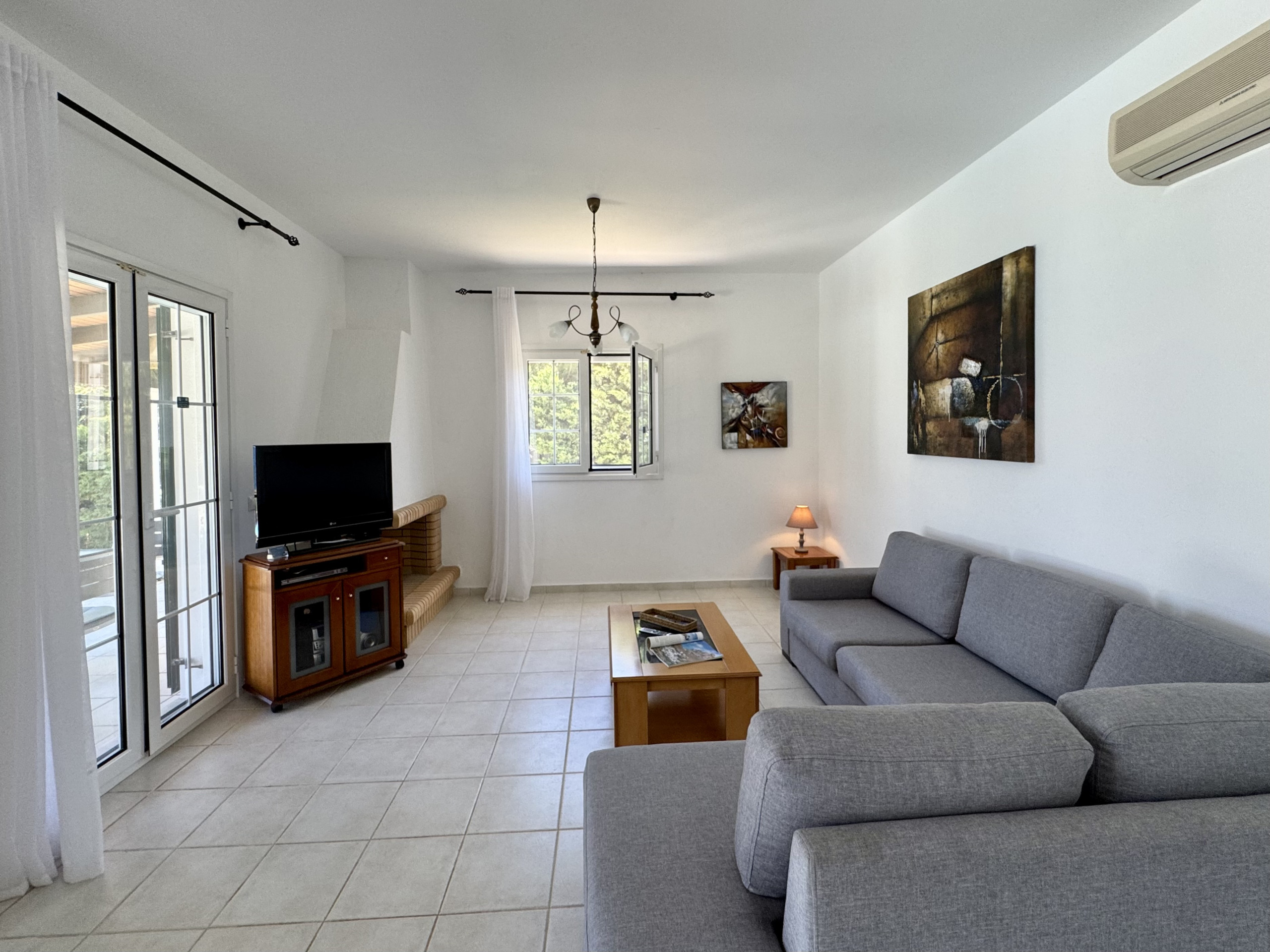 Sitting Area – L -shaped comfy sofa, plasma TV with satellite (limited channels/news only), DVD player and French doors to the covered dining terrace, with pool and sea view. Air Con Unit.